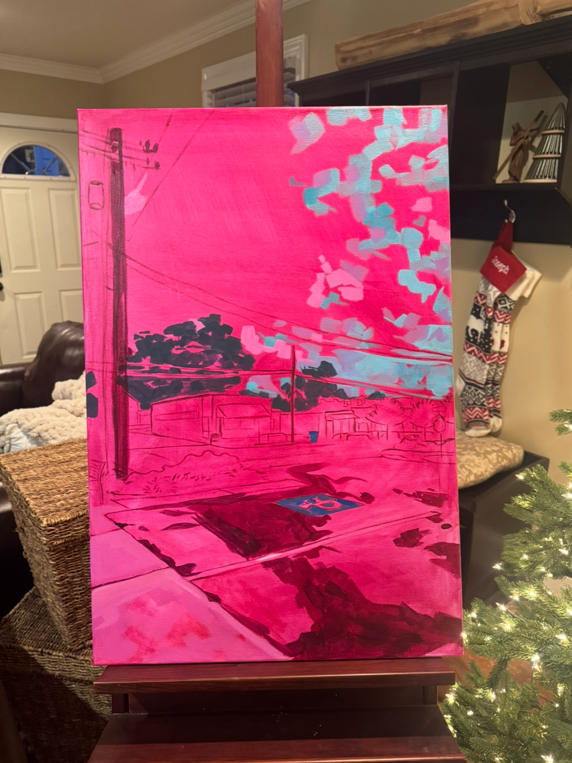 Summer in Mill Town is an abstract landscape painting of West Pelzer, SC, the town where I grew up and spent much of my childhood. Using primarily bright magenta, blue, green, and orange, the painting employs a tetradic color scheme to convey life in an idealized way, shaped by memories and nostalgia. It celebrates the small, often overlooked moments in life where beauty can be found. This piece was featured in the 13th Annual Collegiate Invitational Art Exhibition , sharing its perspective on memory, color, and the personal significance of place with a wider audience.